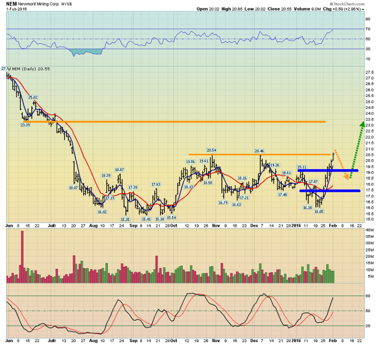 This is the Newmont daily chart. The company is poised to stage a major upside breakout. With both Newmont and Barrick surging higher, institutional and value-oriented money managers are beginning to pay attention to the price action.