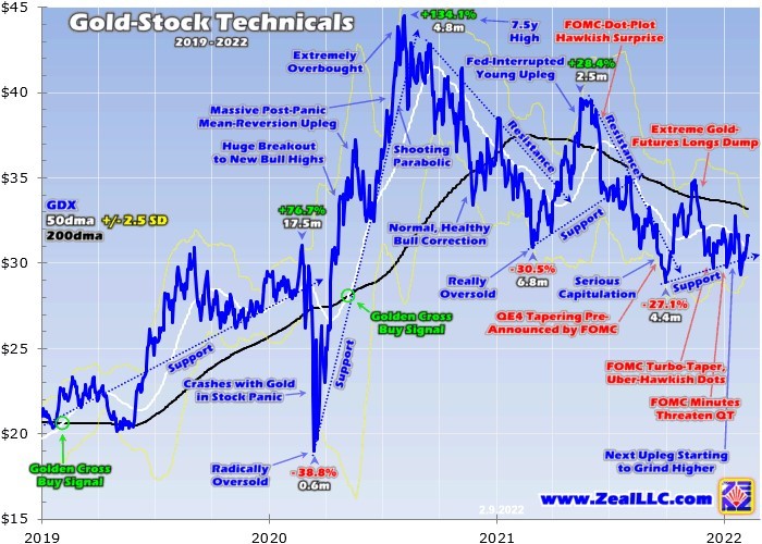 But gold kept climbing on balance anyway, carving higher lows in a much-steeper uptrend than GDX has seen. That uber-hawkish mid-December FOMC meeting accelerating the QE4 turbo-taper and tripling Fed officials’ rate-hike outlook didn’t even faze gold. It clawed back up to $1,829 by year-end. While gold got hit briefly by that FOMC meeting’s minutes discussing QT bond runoffs, its uptrend rallying soon resumed.