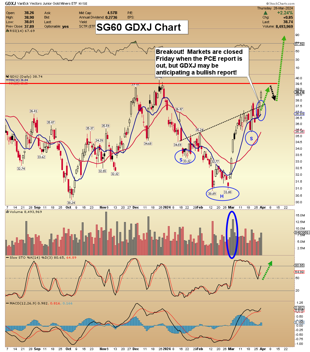 The Easter Friday holiday has stock markets closed but there’s a key PCE inflation report scheduled for release. Gold stock blasted higher this week, likely in anticipation of a bullish report. The charts look awesome! We are major gold stock players for what should be a thunderous two-month rally. My SG60 service is ideal to play the GDXJ, SIL, and intermediate miners and at $229 a year, it's solid value. I have a special offer this week, of $199 for 14 months. If you want the offer, please click this link or send me an email. Thank-you!