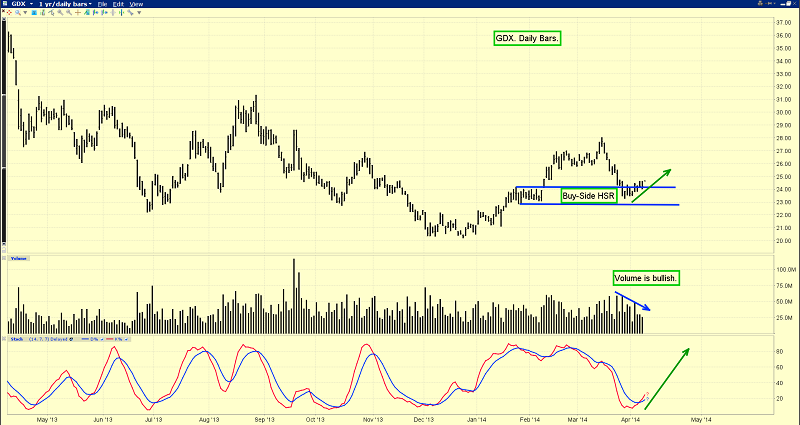 That’s the daily GDX chart. From the highs near $28, GDX has declined on soft volume into buy-side HSR (horizontal support and resistance) in the $22.80 to $24.20 area. Now, it’s beginning to rise up and out of that zone.
