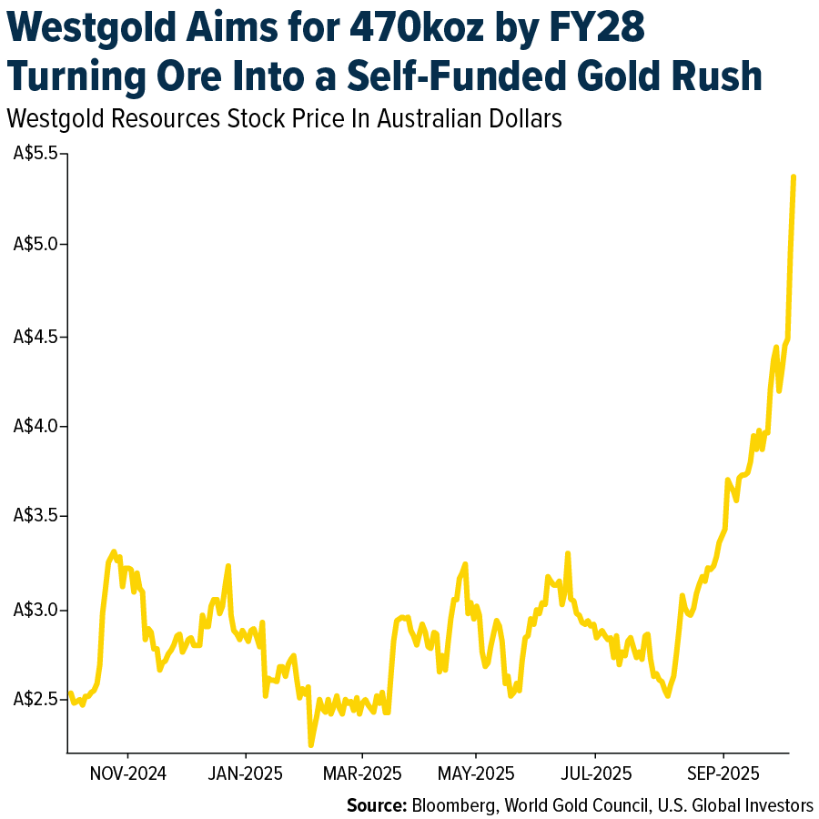 - Westgold Resources expects annual output to rise to over 470,000 ounces by FY28, from 326,000 in FY25, driven by higher-grade ore and better mine feed. With 80% of future supply from current reserves and a fully funded balance sheet, the company anticipates margin improvements despite all-in sustaining costs near A$2,500/oz.