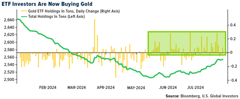- According to Bloomberg, holdings in exchange-traded funds (ETFs) backed by gold are starting to inch higher. The last time they set a new low was in mid-May, suggesting that an enormous run of outflows that started (with some interruptions) late in 2020 may finally be ending.