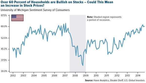 - The chart below from the University of Michigan’s sentiment survey shows over 60 percent of households were bullish on stocks in February. Survey results like these were last seen in July 2007, right before the last bull market took a nosedive. A modest position in gold could act as a diversifier against downside economic risks.