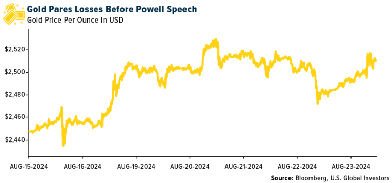- The best-performing precious metal for the week was silver, up 3.52% on expectations of stronger demand, with India nearly doubling solar imports this year, cites Bloomberg. Gold climbed back above $2,500 per ounce after Federal Reserve Chair Jerome Powel signaled that the time has come for interest-rate cuts. TD Securities Bart Melek, global head of commodity strategy, expects bullion to rise further to more than $2,700 in the coming quarters.