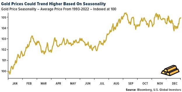 - The chart below shows the past 30 years of gold prices averaged by week and reindexed to 100. There is a distinct seasonal pattern that is depicted by the reoccurrence of gold prices tending to rise in the June – July time window. This seasonal lift in prices is largely attributed to the jewelry industry restocking for the upcoming fall and spring holidays. Now may be an opportune time to consider adding gold and/or gold stocks to your portfolio.