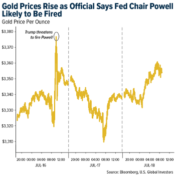 - Gold fell as the dollar gained after President Donald Trump downplayed the prospect of replacing Jerome Powell as Federal Reserve chair. Bullion and the greenback were whipsawed on Wednesday amid a bout of panic over Powell’s future, as a White House official said they expected Trump to soon move against the Fed chief. The president later said he is “not planning on doing anything” to remove Powell, calming markets.