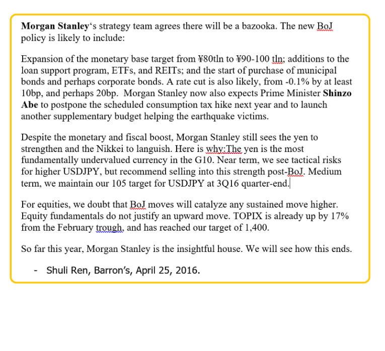 In contrast, Morgan Stanley believes the bazooka shot will have the opposite effect; the Japanese stock market rally will fail…and the dollar will fall against the yen.