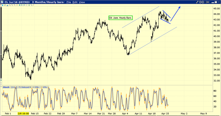 This is the hourly bars oil chart. Oil is the largest component of most commodity indexes, and there’s a nice bull wedge pattern in play.