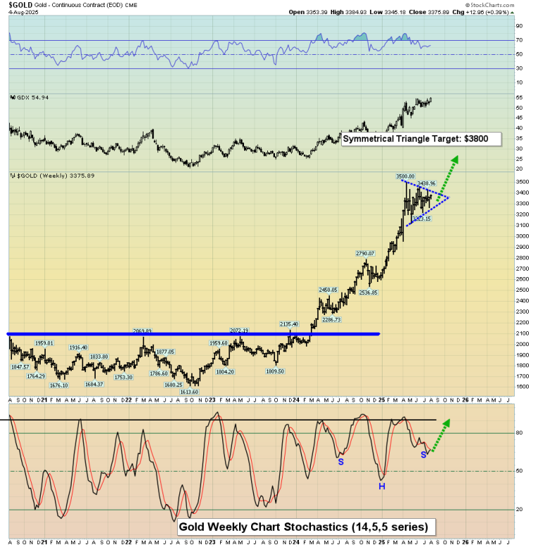 A (14,7,7 series) Stochastics buy signal is coming into play and enough time has passed during the formation of the rectangular drift between $3200 and $3440 to reasonably assume that a major upside breakout is imminent.