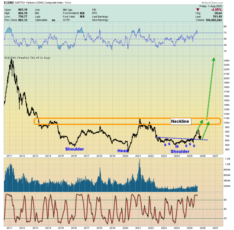 This is the stunning CDNX weekly chart. My projected pullback is in play, and it likely ends in the 700-600 range. A move over the 800 area highs would create fresh institutional interest.