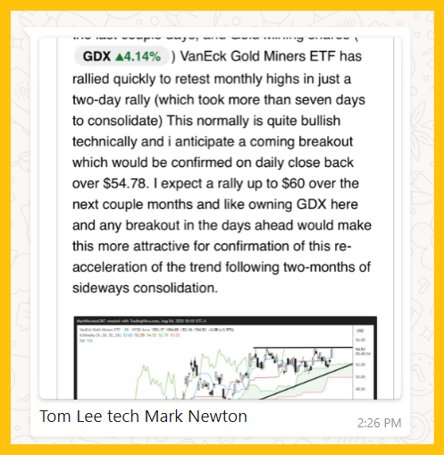 Tom Lee is a very influential analyst and fund manager. He and his team have recently begun to focus on gold stocks. Interestingly, his top technician has the same short-term $60 target that I’ve issued and a move to that price zone would bring in even more institutional investment. To sum it all up:
