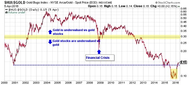 A little patience is warranted during this pullback given the technical signals, but the gold bull market that started in December of 2015 remains firmly intact. Those concerned that they have missed the train, should not worry. Although many gold stocks have doubled in the first few months of the year, mining stocks still remain near their most undervalued levels (relative to the metals) ever. Even the mining stocks that have doubled in 2016, would still need to climb another 5 to 10 times to reach their 2011 highs.