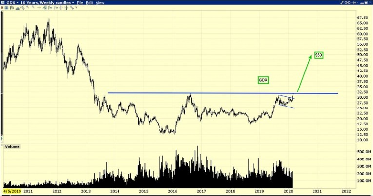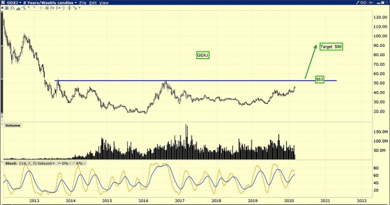 A weekly close over $53 would target the $90 price zone. Short-term traders can play it with JNUG, and investors can buy the ETF and/or some of its component stocks.