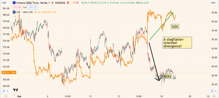 Double-click to enlarge this GDX vs QQQ divergence chart. On Friday, the stock market tumbled, and GDX surged higher. This is normal action when stagflation rules the roost, and it’s beginning to rule it now in most of the Western world.
