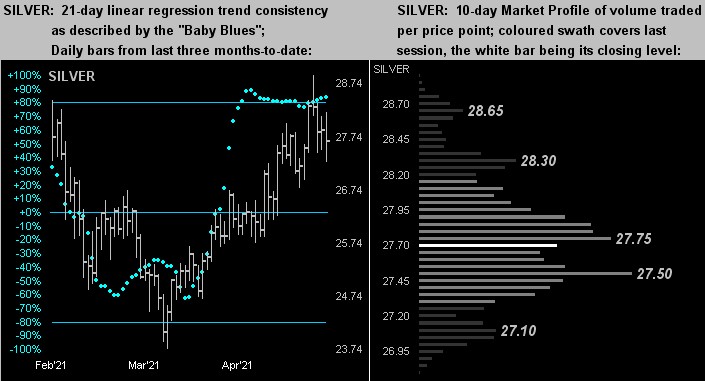 Refreshing too is our two-panel image of Gold's daily bars from three months ago-to-date on the left and the 10-day Market Profile on the right. So positive are the two panels that we might have to withstand the contrarian Shorts exposing themselves for a bit, as is their wont. But at the end of the day, both the 1600s and 1700s may well be for Gold's race car histoire: