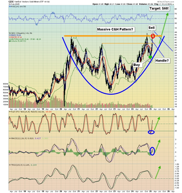 There could be no handle at all. Not all chart patterns are “textbook”… and given the generational undervaluation of gold stocks versus gold, investors need to be as open to a near-vertical surge in the GDX price as to a handle/pullback.