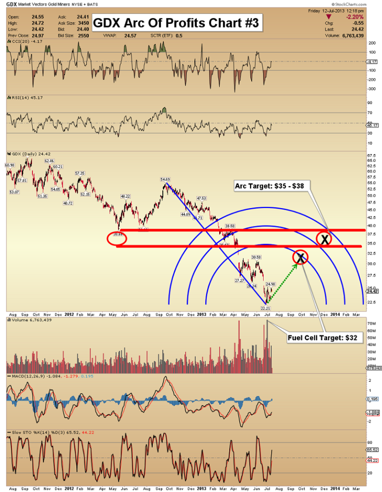 · GDX should be able to rally to $35 - $38, which is the area between the 2nd and 3rd arcs on this chart.