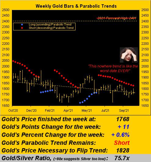 And then there's Gold (quit snoring in the back there), which just completed its 16th week of parabolic Short trend, a tie for sixth in duration since 2001. Remember: Gold's settle back on 02 July when this trend formally began was 1788 vs. today's 1768, the average weekly close therein being 1787. That is about as meek an unending Short Trend as we'll find. And to quote our wonderful futures mentor (one PFH) from three decades ago: "Well, if it can't go down, then it's gonna go up." No time like the present, what? Here are Gold's weekly bars and parabolic trends since this time a year ago: