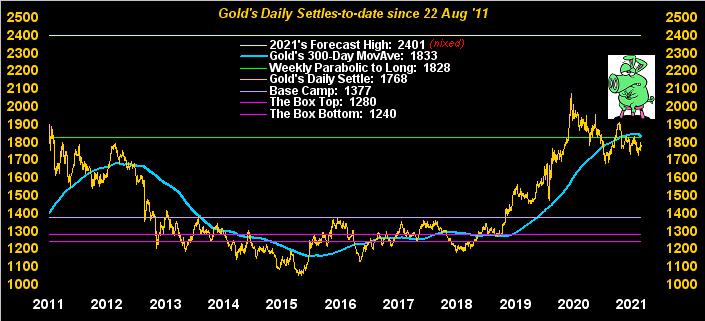 Broadly, Gold has basically been pulling back since achieving its All-Time-High at 2089 on 07 August 2020. So in looking at this view of the daily closes across the past 11 years, the recent technical staleness obviously doesn't reveal the fundamental firmness for which we're all twiddling our thumbs to make a dramatic price appearance: