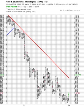 The chart below – courtesy stockcharts.com shows that gold shares catapulted up from a bear trap sell signal on December 26th and that the new price objective of 102 – if reached – will result in an upside penetration of the bear trend line.