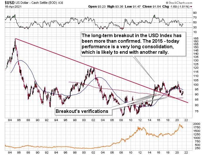 Of course, just because the bottom is likely to be formed in the following months, doesn’t mean that it’s in at this time or that it’s a good idea to ignore the bearish implications of the situation in the USD Index (as well as other indications pointing to lower gold prices).