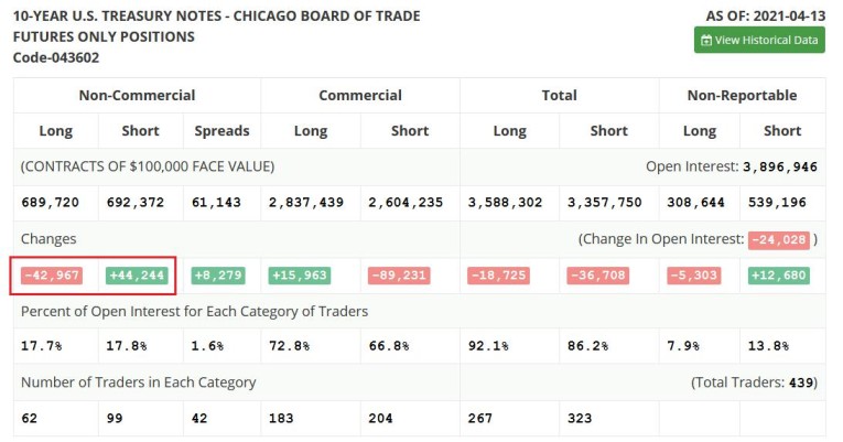 Trending in the opposite direction of the USD Index futures, non-commercial (speculative) futures traders have moved from net-long to net-short the U.S. 10-Year Treasury Note . For context, bond prices move inversely of yields, so a lower U.S. 10-Year Treasury results in a higher U.S. 10-Year Treasury yield. And after non-commercial (speculative) futures traders reduced their long positions by nearly 43,000 contracts and increased their short positions by more than 44,000 contracts, speculators went from being net-long nearly 84,600 contracts to net-short nearly 2,700 contracts.