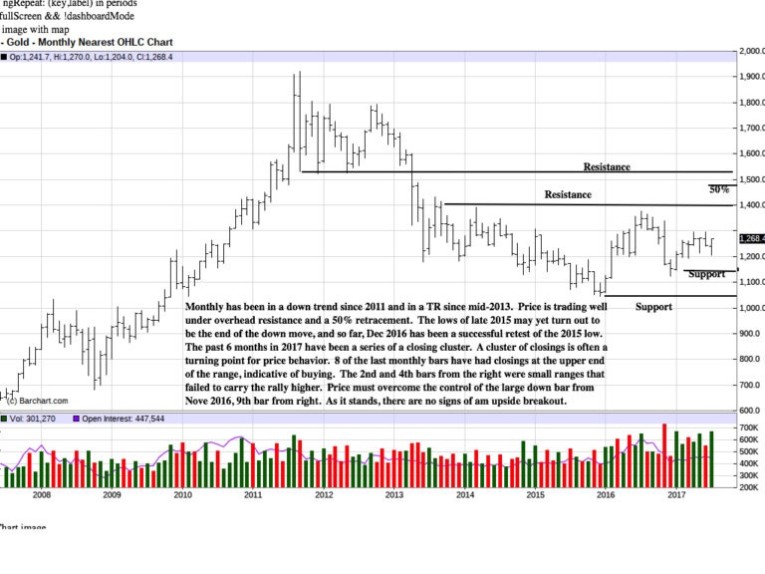 Silver remains weaker, relative to gold. For July to prove its potential for change, price needs to follow through to the upside, or, at a minimum, have a shallow correction.