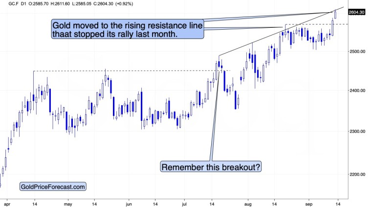 Gold moved above the mid-August high, and it just moved slightly above its rising resistance line – the same line that stopped the rally in August. Is this a top? This could be the case.