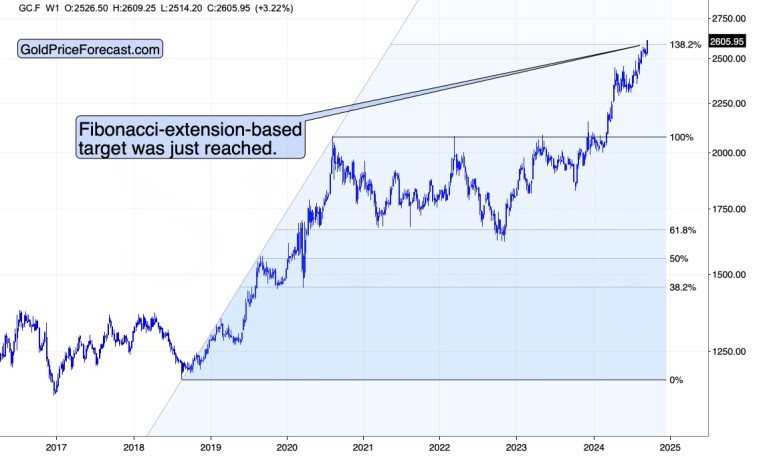 On a more long-term chart, we see that based on gold’s most recent upswing, it reached it’s Fibonacci-extension-based target, which means that perhaps what was likely happen based on this technique, has already happened.