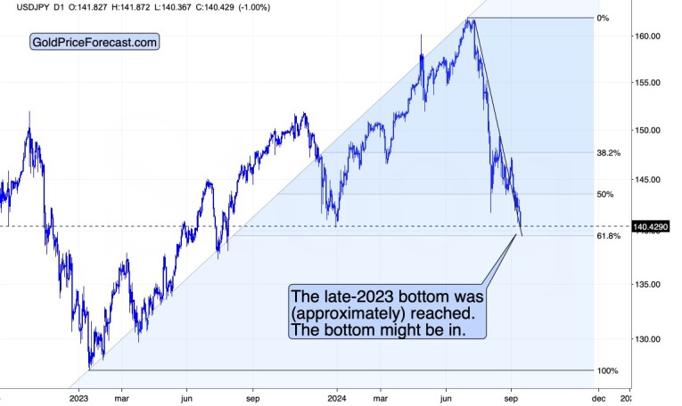 The USD/YEN just moved to its late-2023 bottom, which serves as very strong support. The same goes for the sharply declining support line – it was just reached.