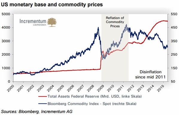 While from 2008 to 2011 the prices of both stocks and commodities (and thus the prices of real assets) were driven higher, a disinflationary trend in commodity prices can be discerned since 2011. Since then, money supply inflation primarily induced financial asset price inflation. This phase has culminated in a disinflationary tsunami in 2014. A strengthening US dollar exerting deflationary effects once again delayed the probability of a rate hike and left the much-desired zero interest rate environment in place, benefiting stock markets.