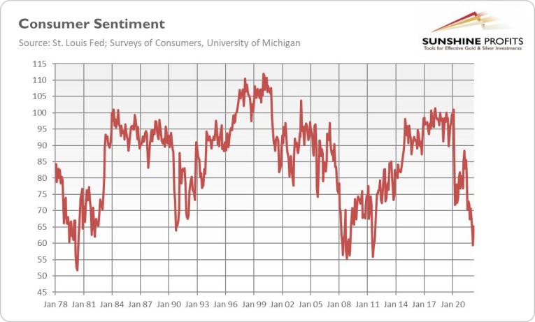 So far, surging real interest rates are creating downward pressure on gold. However, steep hikes in the federal funds rate imply that we’ll see the peak sooner. What’s important is that Powell is not Volcker and won’t swallow so much economic pain to combat inflation. Even if he was ready to do so, the current, highly indebted economy is not, and when the tightening cycle is over and investors start to expect interest rate cuts rather than further hikes, gold should rally again.