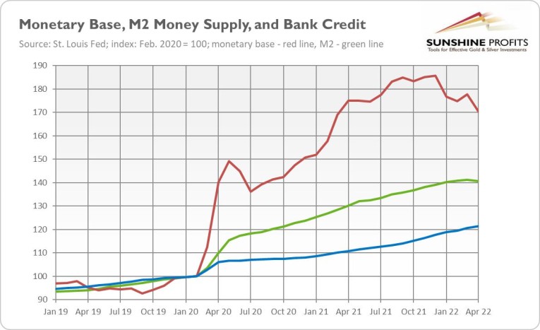 Now, let’s apply this theory to the present situation. In a response to the coronavirus pandemic, governments all over the world panicked and introduced costly lockdowns. To compensate for the losses, the Fed slashed the federal funds rate to almost zero and boosted the monetary base by 40% in just two months. But what distinguished this episode from the previous monetary injections is that the Fed introduced many liquidity programs for Main Street. As a consequence, in the two years after the outbreak of the pandemic, the broad money supply M2 rose by more than 40%, while bank credit increased by about 20% (see the chart below).