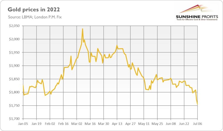 Gold’s performance was actually better than the chart suggests. This is because the yellow metal held its ground amid relatively steep hikes in the federal funds rate. The Fed hiked interest rates by 75 basis points in June, following a 50-basis point raise in May and a 25-basis point liftoff in March. The hawkish FOMC meeting contributed to the plunge in the stock market and cryptocurrencies, but gold remained generally resilient, clearly outperforming other assets. However, in early July, the price of gold sank deeply below $1,800, so the period of resilience could end and the downward wave could start.