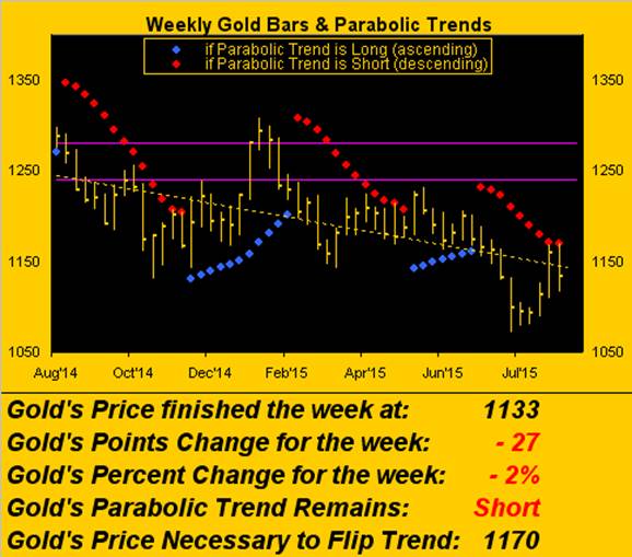 Still, neither outsmarted was Gold. In typical knee-jerk reaction on Thursday to the Q2 GDP revision, Gold immediately tested the week's low from the prior day (1117), only to then wise up, spending the balance of the week moving back up, and indeed clearing the 1140 level upon The University of Michigan reporting a reduction in its Sentiment indicator. Following a +4% gain for Gold in the prior week with a -2% loss this time 'round, there's nonetheless no denying price's having put in its fifth consecutive "higher low" in-a-row toward settling yesterday (Friday) at 1133 as we below see:
