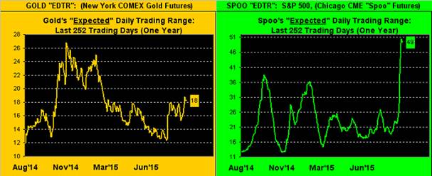 The record (since 2001) of consecutive weekly "higher lows" is nine on three different occasions (once in 2003, again in 2006 and yet again in 2007). Now, these most recent five "higher lows" are certainly a sign of resiliency, or at least reluctance to sell Gold en masse as we've too oft seen in recent years, (another sign that the bottom is in?). Again, we're reserving such declaration until Gold rises above its 300-day moving average (1212), the average itself turning upward, and price clearing that 1240-1280 resistance zone (bounded by the purple lines in the above chart). But of present interest is what one might call the persistence of disinterest in Gold. We only mention that as given the current gyrations in the S&P 500, Gold appears rather docile. To wit, here are our expected daily trading ranges ("EDTR") for both Gold and the S&P from one year ago-to-date. Gold on the left is at best treading water mid-chart (at 18 points per day) whilst the S&P on the right is near the max (at 49 points per day):