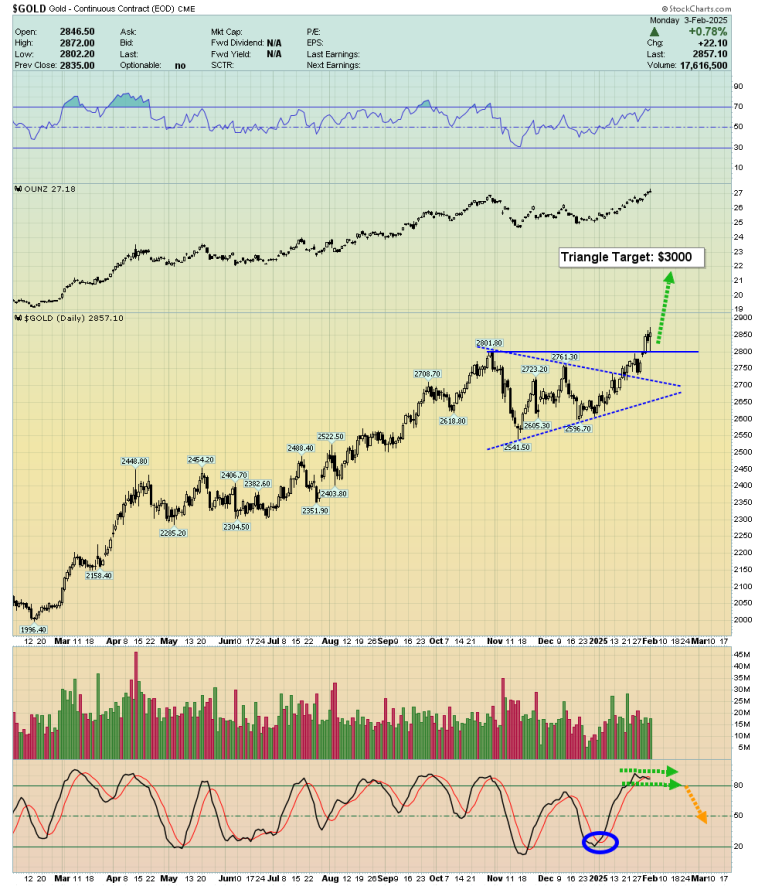 This is the stunning weekly chart. The lead Stochastics (14,5,5 series) line is now overbought but the target of the beautiful symmetrical triangle is $3000+. Stochastics likely stays overbought while the price moves nicely higher.