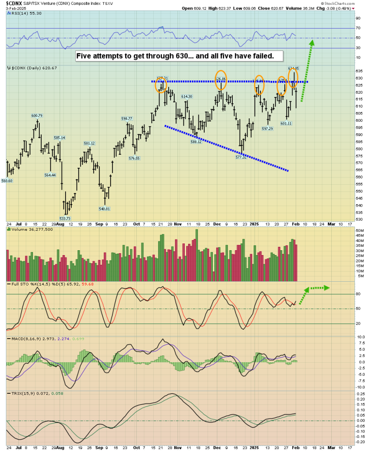 This is the CDNX daily chart. Will the sixth time be a charm? I think so, and the huge reversal bar yesterday and the momentum zone buy signal for 14,7,7 series Stochastics suggests it could happen by the end of this week.