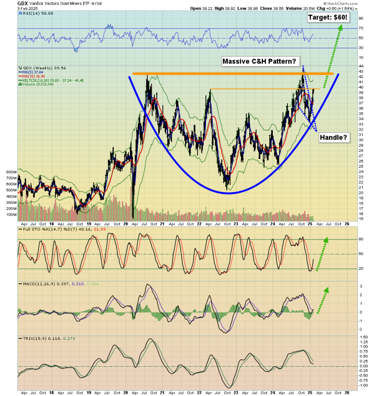 This is a spectacular weekly chart. The massive C&H action suggests that a 5%-10% move higher for gold (to $3000-$3200) could be accompanied with a 50% surge for GDX!