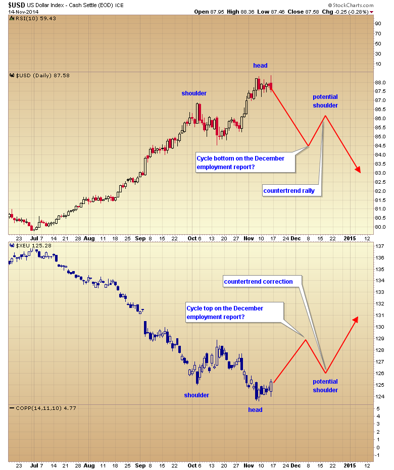 Considering that the daily cycle is now on day 22…and late in the cycle timing band, the odds are good that the reversal Friday marked at least a daily cycle top in the dollar index. If that’s the case then the euro’s daily cycle should have bottomed. Looking at the euro chart it does appear that the euro bottomed on November 7.