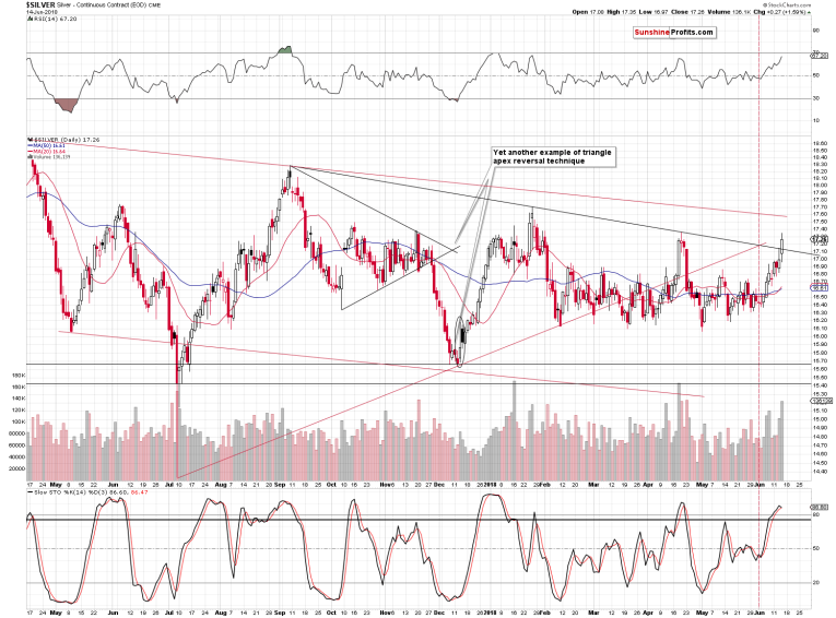 Silver is at $17.14, so there was no invalidation yet, but it strongly seems that putting “yet” in bold is justified. In yesterday’s alert, we commented on the above chart in the following way: