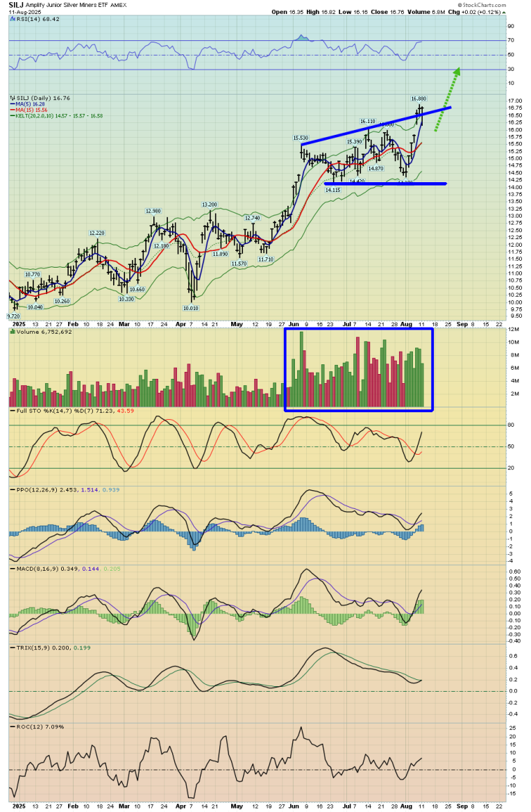SILJ is pushing up from a broadening pattern. These formations indicate a loss of control in the market. Will this week’s CPI and PPI show a loss control, related to the tariffs? If so, will money managers surge into the miners, regardless of what happens to gold and silver? It’s likely to happen soon!