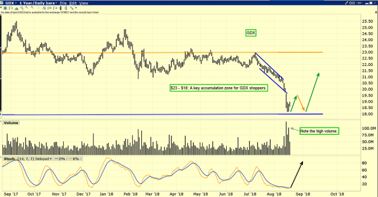 Now that GDX has arrived in the base area of my $23 - $18 accumulation zone, investors need to be alert for signs of bottoming action.