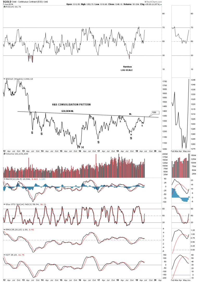 It’s hard to believe that the massive H&S consolidation pattern we’ve been following for several years began to develop all the way back in 2013 during the initial crash off the 2011 high. This weekly line chart shows the price action closing this week right on the neckline at 1350. Note how many touches the neckline has experienced from below with each one backing off. Now the question remains, how may bears are left to defend the 2013 neckline? There is a good chance that if they are exhausted that the price action could just spike right through the neckline this time around completing the massive H&S base which would be long term bullish. Big patterns lead to big moves.