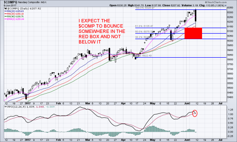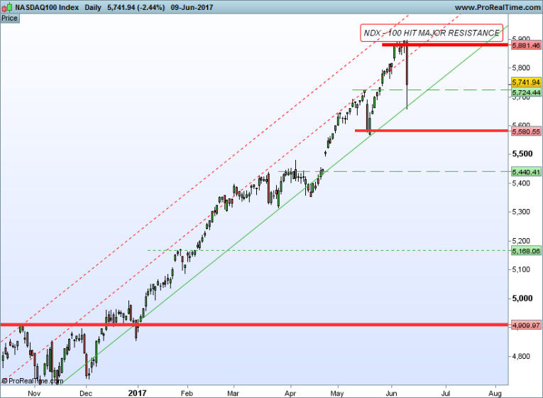 The QQQ’s were trading at $140.15 per share last Friday, June 9th, 2017, but by afternoon, they were down $3.42 (-2.38%). Year-to-date, the QQQ’s have gained 18.29% versus an 8.75% rise in the SPX index during the same period. The heavy losses were focused and contained. It was an orderly coordinated profit taking day!