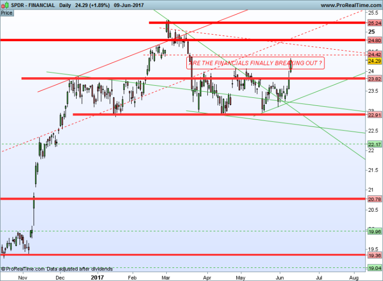 The banking stocks were among the beneficiaries of the tech slump, with BAC, GS and JPM all defying their head and shoulders setups at this time. The XLF, is suggesting further near-term gains for the financial sector while heading into this coming week’s FOMC meetings on June 13th and June 14th, 2017.