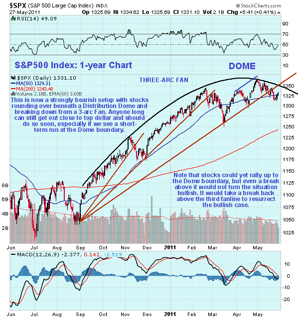 As you are probably well aware, everyone has gotten complacent over the broad stockmarket, with premature top callers continually getting burned as it has somehow stayed levitated, but as we will now see the situation is getting more and more dangerous with passing time. This is because the market is rounding over beneath the large parabolic "Distribution Dome" shown on our 1-year chart for the S&P500 index below. Few traders understand these Dome patterns or what they portend. The rounding nature of the pattern is evidence that profit takers are increasingly overwhelming fresh buyers whose efforts to drive the market higher are blunted to the point that they have no effect at all and once the Dome starts to roll over, as is happening now, the bears have gotten hold of the ball, and it only takes the re-emergence of fear in the market to precipitate a potentially severe decline. Add into the mix that the market has just broken down from a 3-arc Fan pattern as pointed out by Richard Russell and also shown on our chart, which usually precipitates a drop, and you have the recipe for a potentially heavy selloff. Here we should note that Domes don't always lead to bearmarkets, as they can simply be a form of rounding correction - sometimes the market breaks suddenly above the Dome boundary and a new major upleg ensues, but here the situation is complicated by the Fan breakdown - so it will take not just a break above the Dome boundary, but a break back above the 3rd fanline to turn the market bullish again.