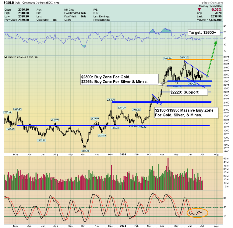 The price is underpinned with several massive floors of support. I’ve outlined $2265 as a solid zone to buy silver/mining stocks and $2220-$2000 to buy more gold.