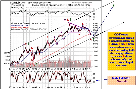 Next, we want to study the pattern from 2011, labeled wave 4. We want to understand it, label it accurately, and project when it will end, and at what price it will end. Initially it looked as if wave 4down was simply forming a five wave descending bullish triangle. However, Friday, April 12ths’ nearly 100 point plunge broke decisively below the support shelf for such a triangle pattern, meaning something else is going on. There are a ton of overlapping waves in this pattern from September 2011, so we know it is corrective, and not the start of an impulsive Bear market in Gold. Gold has not topped, and is not in a Bear market. Let me be clear about that. What is happening is wave4 decided to become more complex. Wave fours and wave b’s are notorious for acting unpredictably, having a mind of their own, and metamorphosing from one pattern to another.