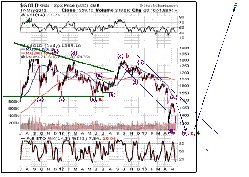 Where and when will wave c-down of 4 bottom? One possibility is the intersection of the declining trend-channel for wave c-down we show in the previous chart with the bottom boundary of the rising trend-channel from 1999 to 2013. That projects a bottom for Gold around 1,375ish to 1,400ish, around June, 2013. The above labeling suggests waves {iii} down and {iv} up have completed, and the final wave {v} down is well underway, has a bit more downside left in it short-term, but when it finishes, Gold’s wave 4 will have bottomed.